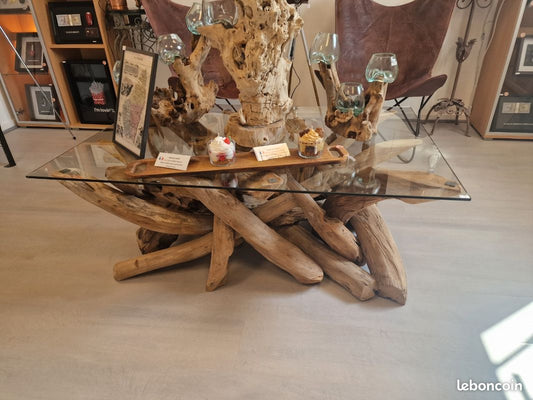 Table Basse en Verre et Bois Flotté – Pièce Unique