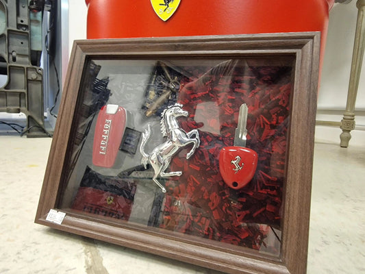 Cadre décoratif Ferrari – Clé Ferrari & logo métallisé sur fond carbone forgé (Format 20 × 25 cm)