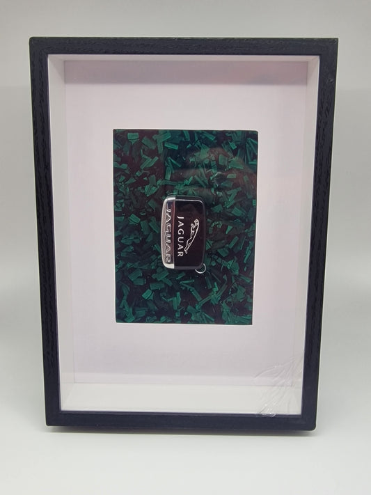 Cadre décoratif Jaguar – Clé Jaguar sur fond carbone forgé vert (Format A4)