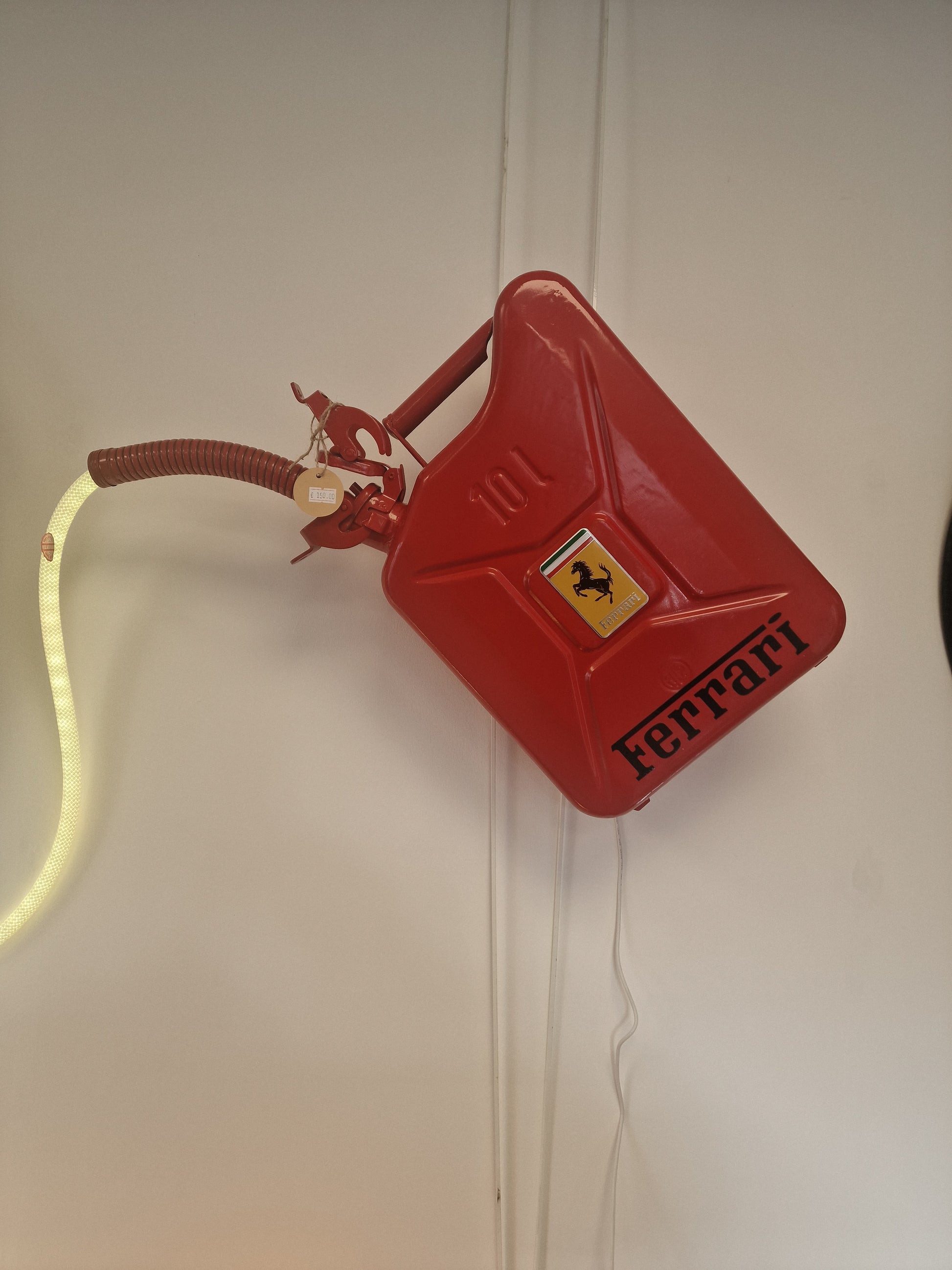 Donnez du caractère à votre intérieur avec ce luminaire unique, entièrement réalisé à partir d’un véritable jerrycan d’essence customisé Ferrari. Transformé à la main, ce jerrycan rouge iconique devient une lampe murale ou posée au sol, idéale pour les fans d’automobile, de décoration industrielle ou d’objets hors du commun.