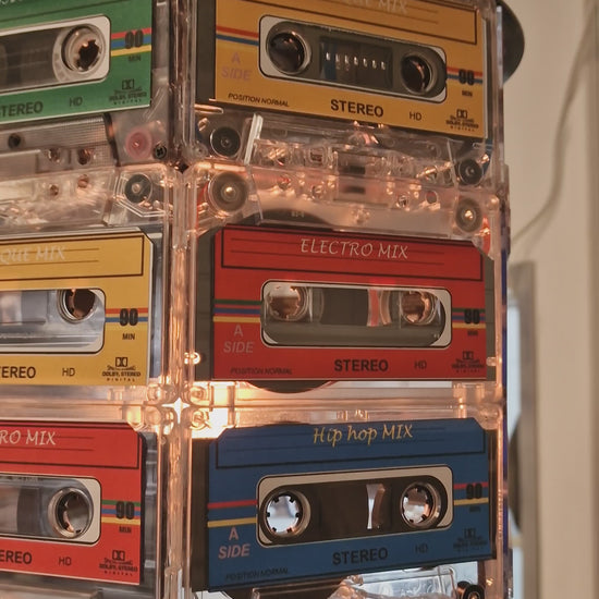 Chaque création est unique : la disposition des cassettes peut légèrement varier, rendant chaque lampe encore plus authentique.