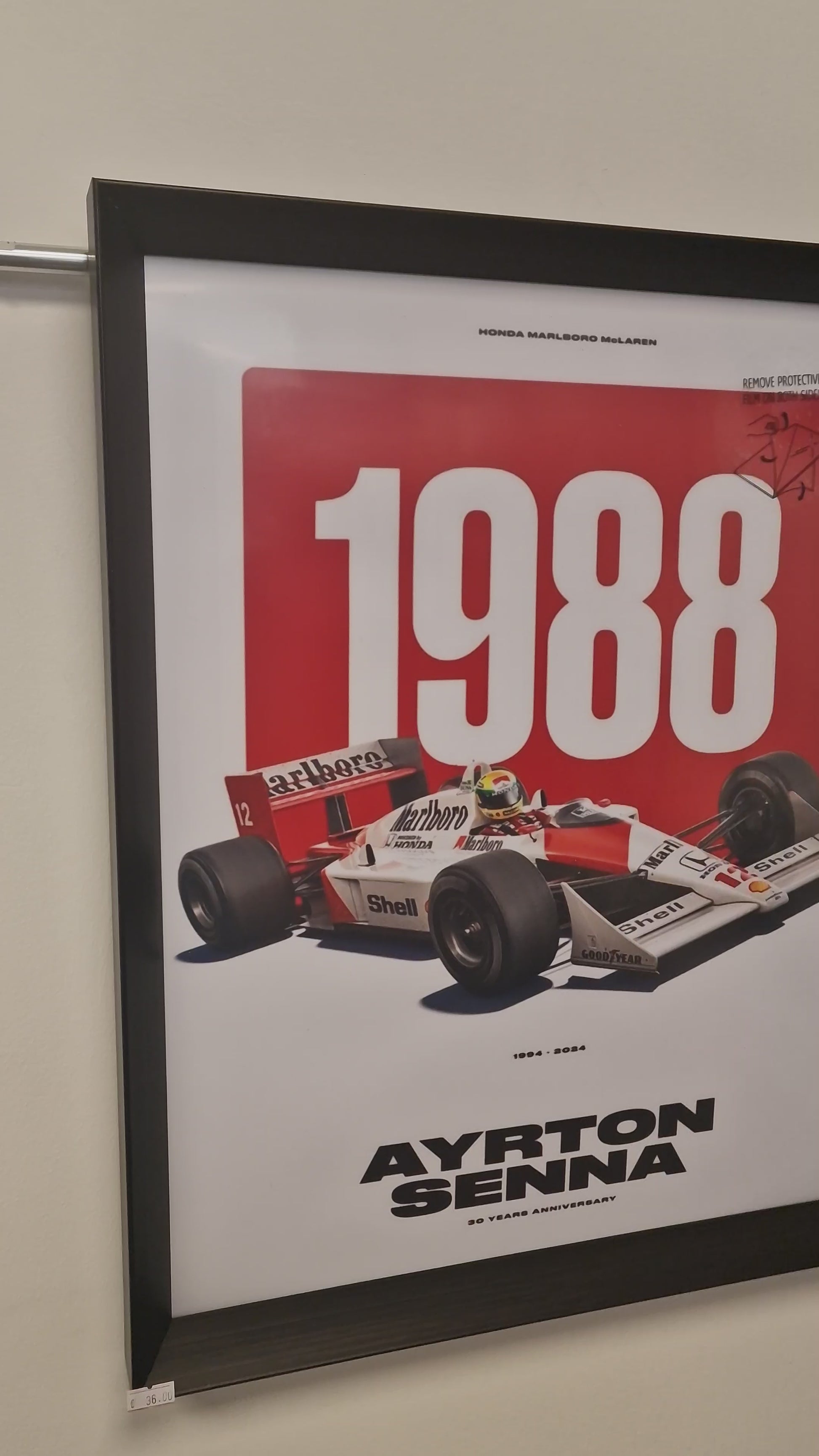 Revivez l’année mythique 1988, celle du premier titre mondial d’Ayrton Senna, grâce à ce cadre décoratif réalisé artisanalement. Cette création met en avant la légendaire McLaren Honda MP4/4, considérée comme l’une des Formule 1 les plus dominantes de l’histoire, illustrée dans sa célèbre livrée rouge et blanche Marlboro.