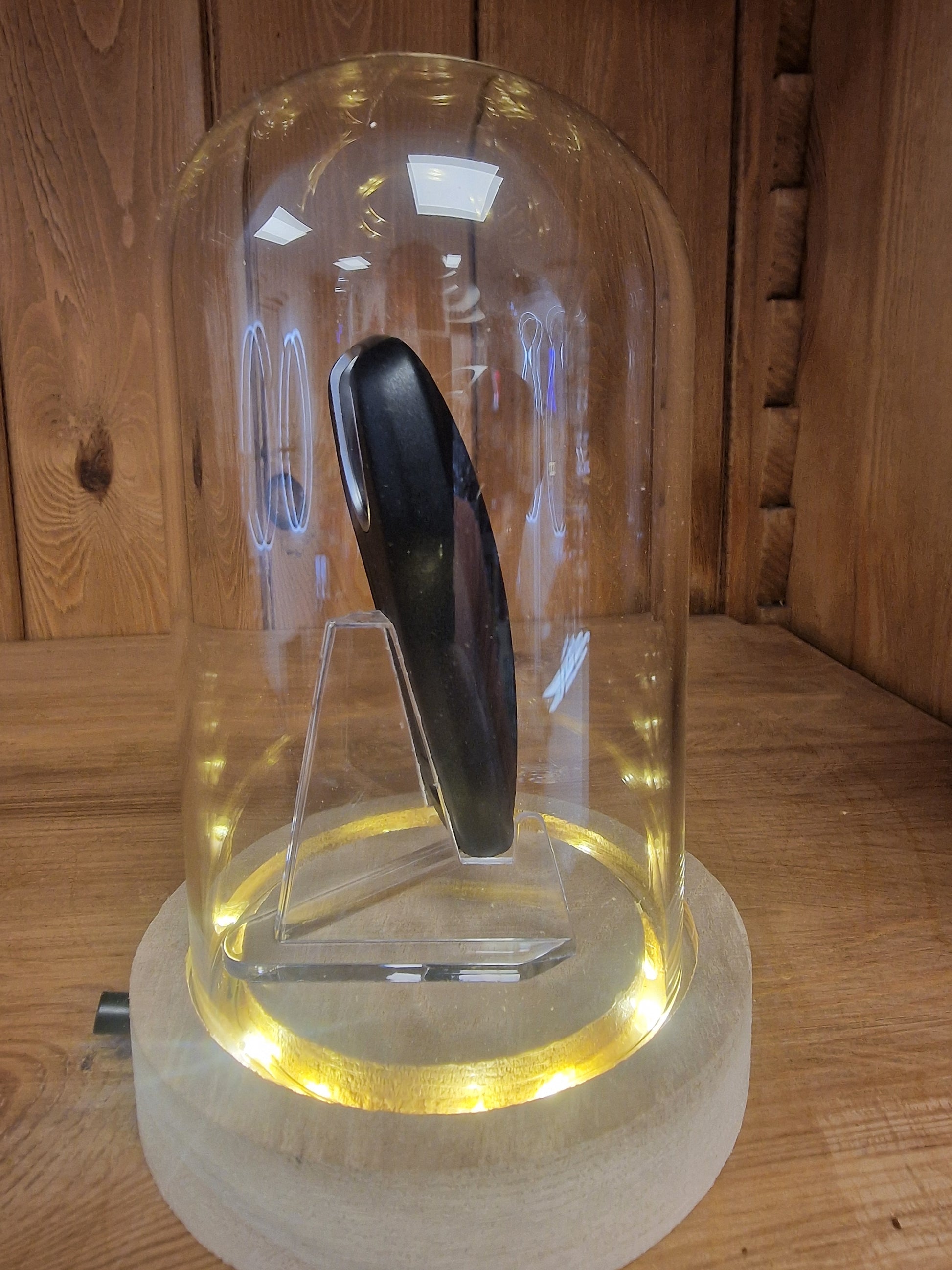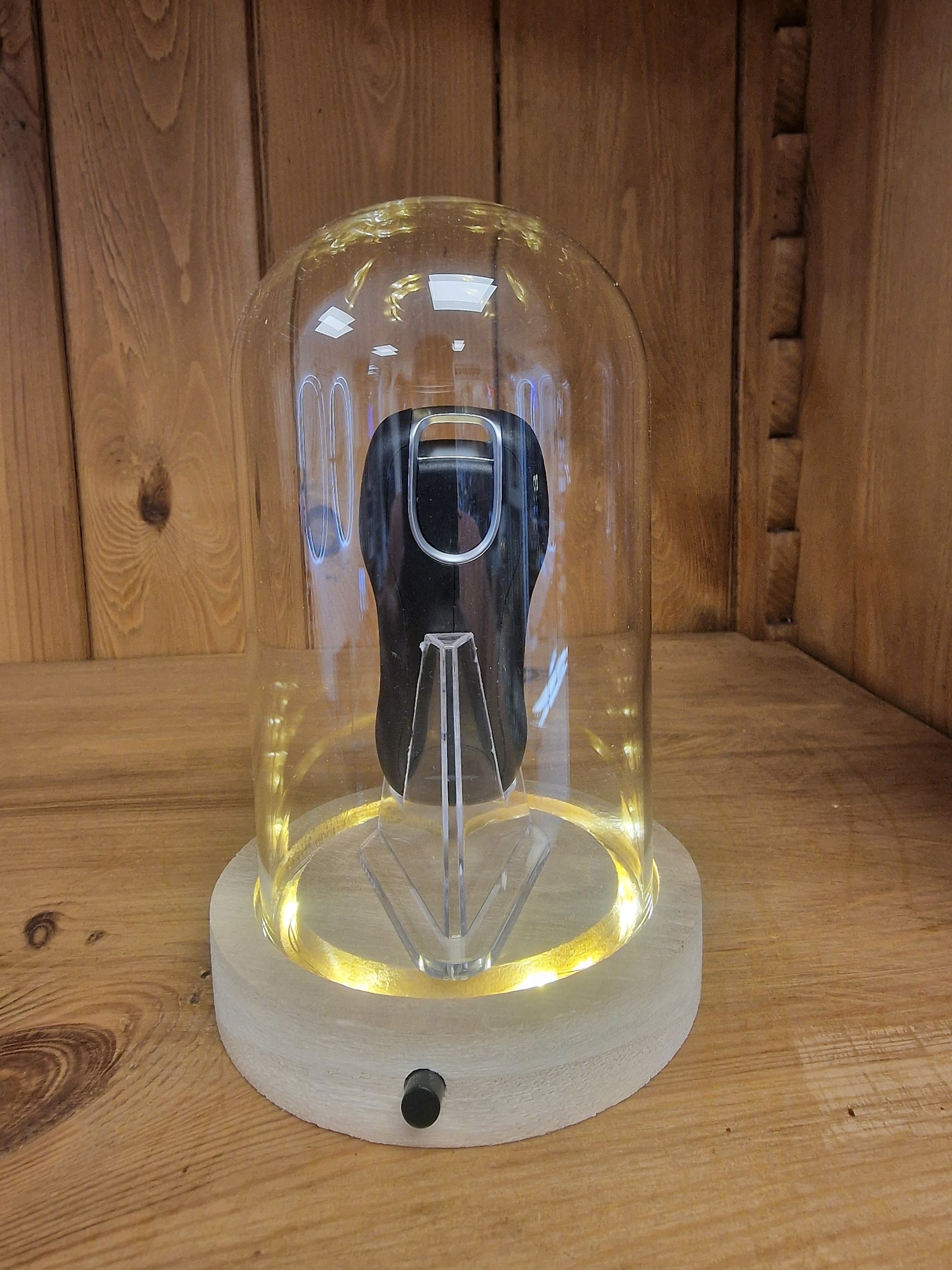 La clé est soigneusement positionnée sous une cloche transparente de 10 cm de diamètre et 16 cm de hauteur, reposant sur un socle en bois naturel intégrant un éclairage LED chaud. La lumière diffuse sublime les lignes de la clé et crée un véritable effet vitrine, idéal pour un intérieur moderne ou un espace dédié à l’automobile.