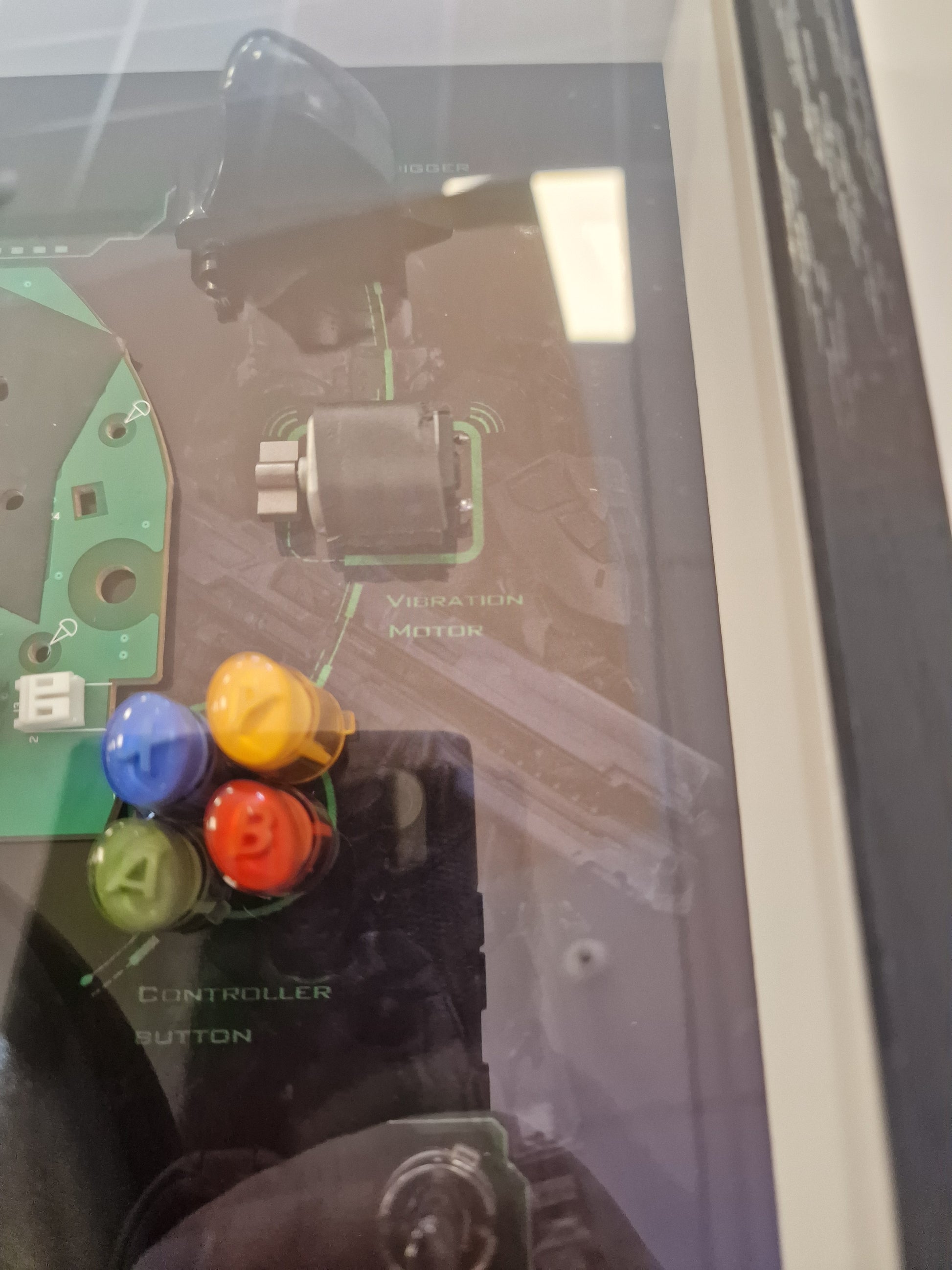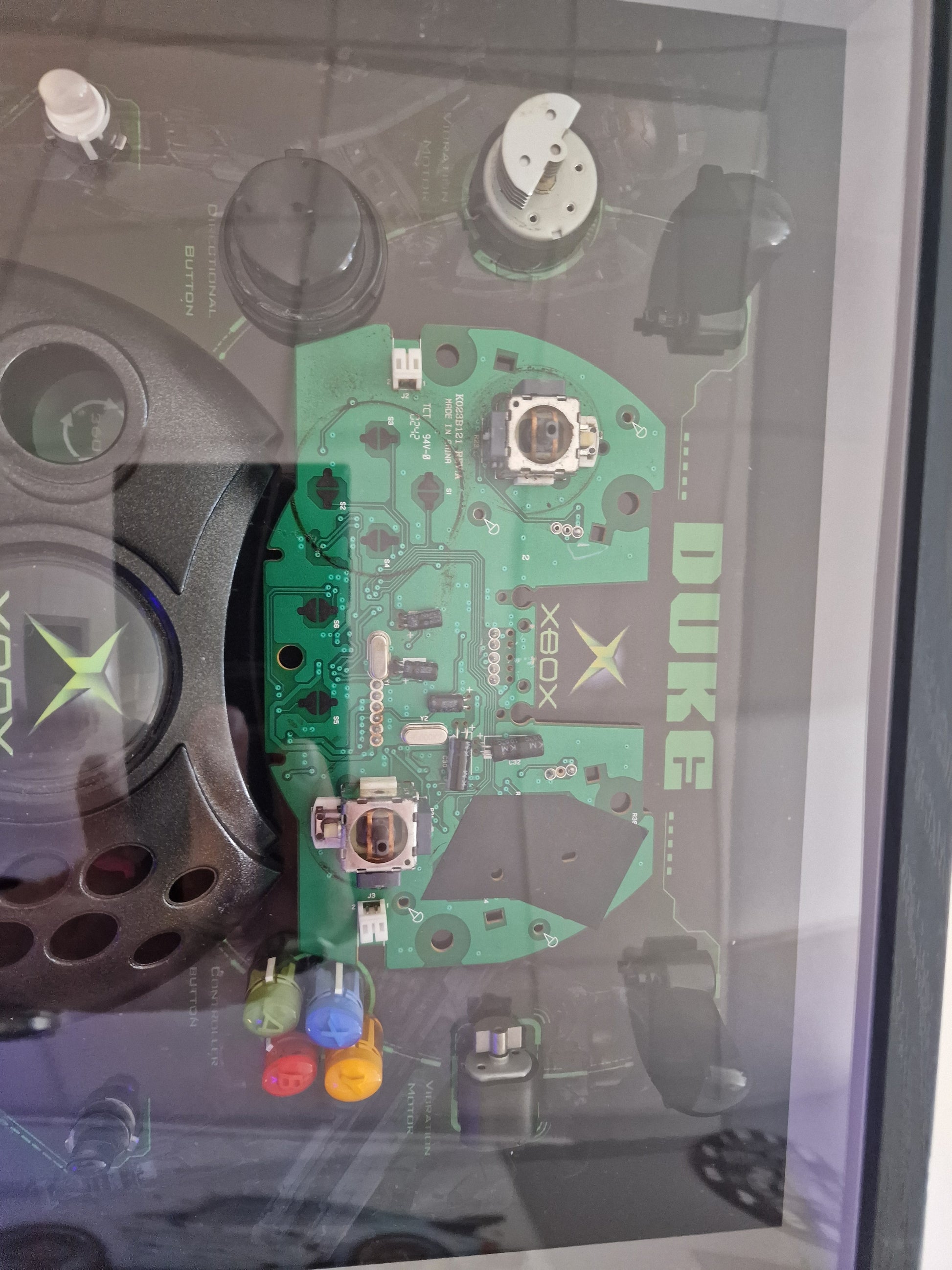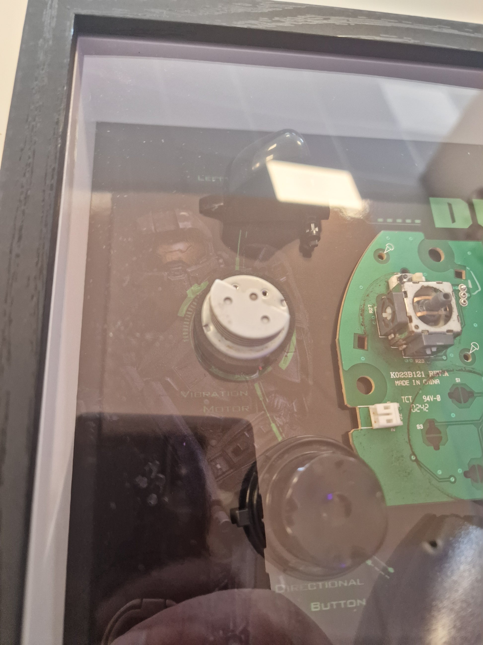 Découvrez une pièce unique dédiée aux passionnés de jeux vidéo : un cadre décoratif 30x30 cm réalisé à partir d'une véritable manette Xbox première génération, la célèbre "Duke", entièrement démontée afin de révéler ses composants internes.