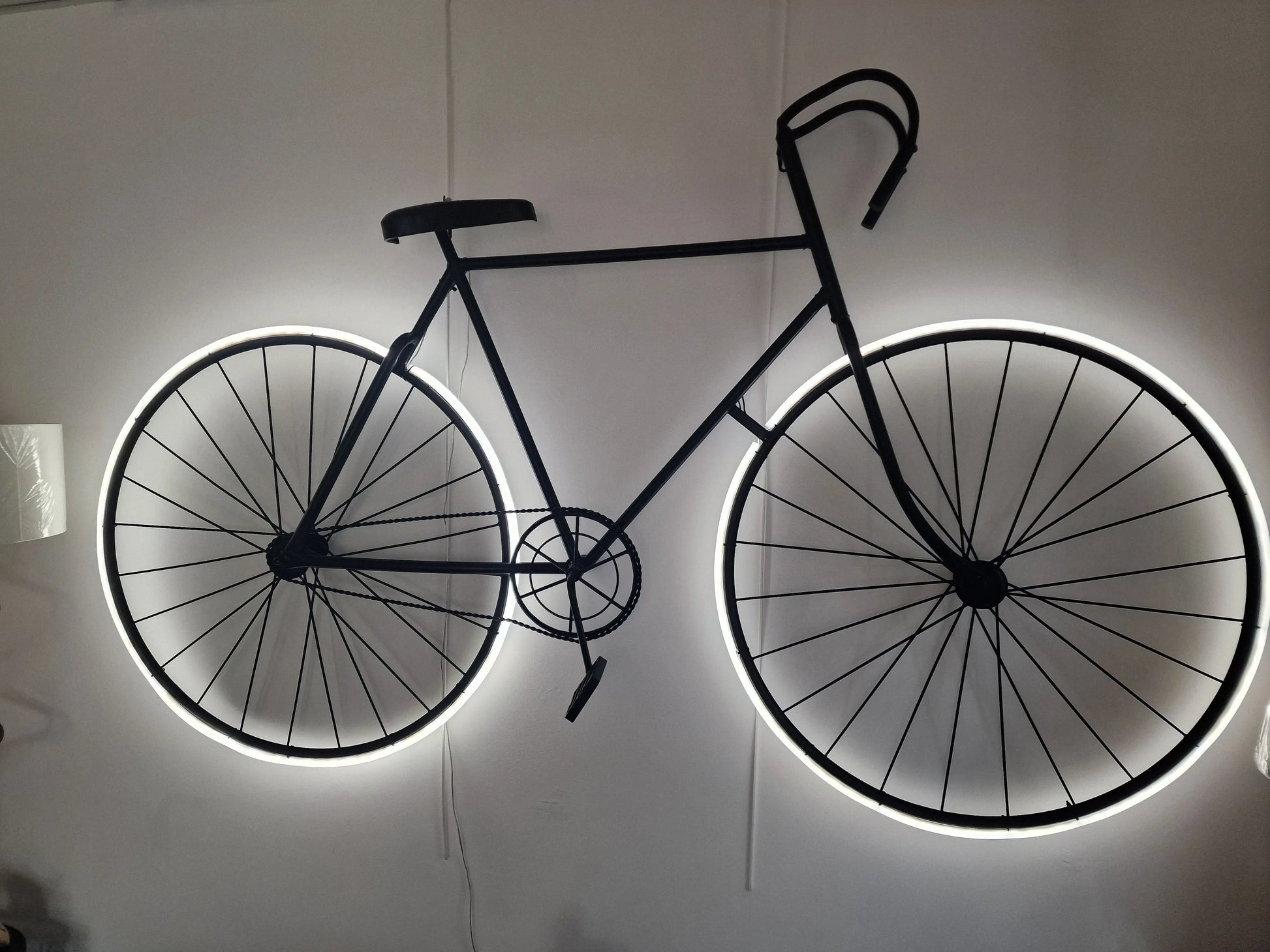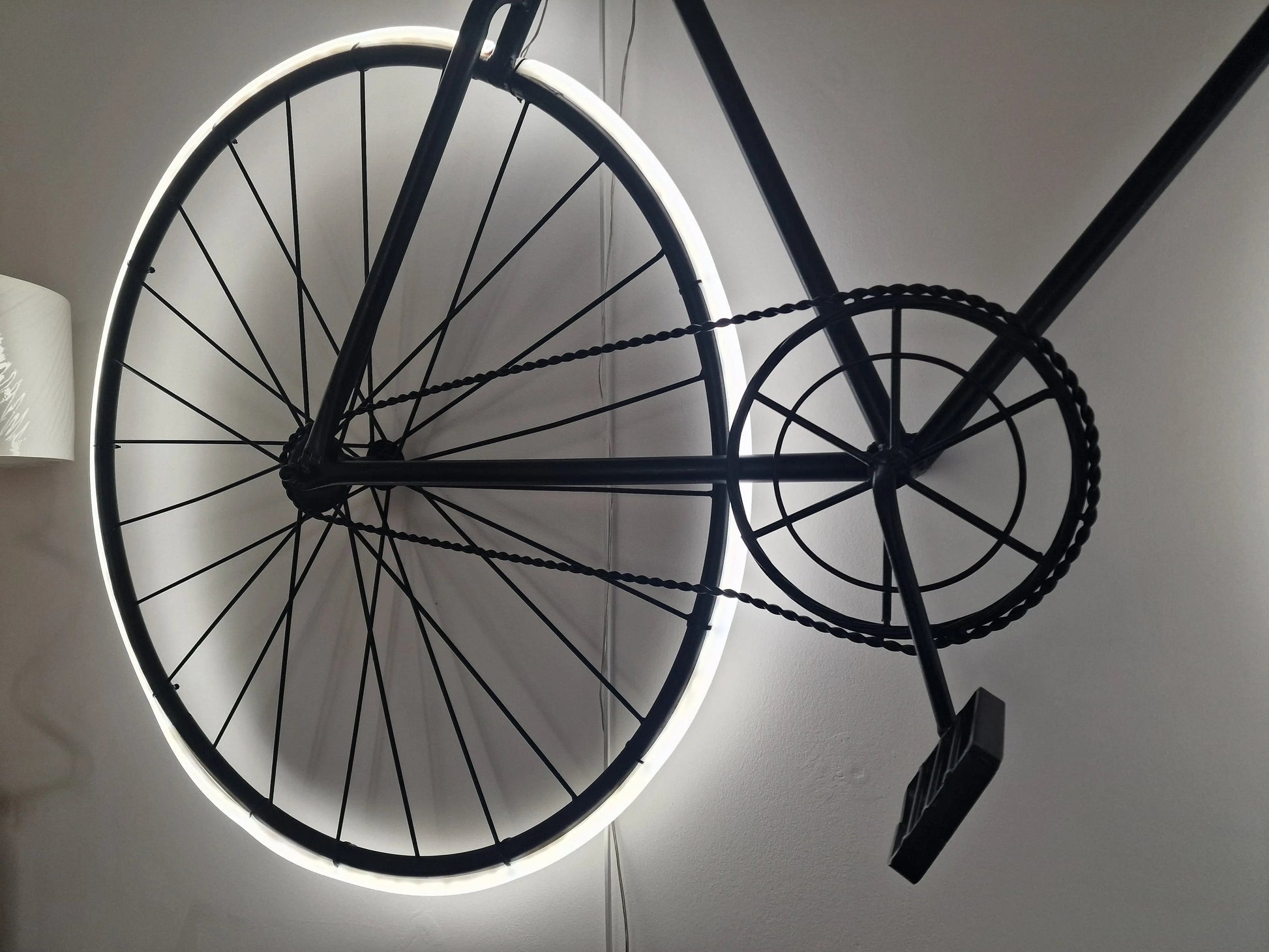 Transformez votre mur en œuvre d’art avec cette applique murale vélo lumineuse, une pièce unique réalisée à la main à partir d’un véritable vélo de décoration. Les roues sont équipées de rubans LED blanc froid, créant une ambiance lumineuse moderne et captivante.